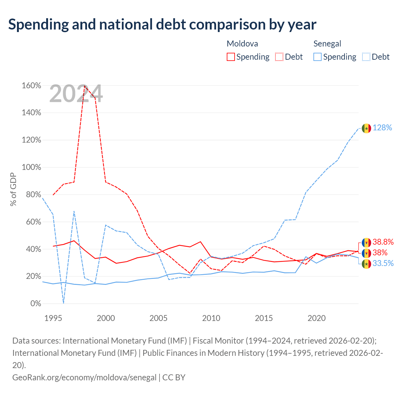 Moldova has $7.06B in government debt (38.8% of GDP), compared to $42.1B (128.4% of GDP) in Senegal.