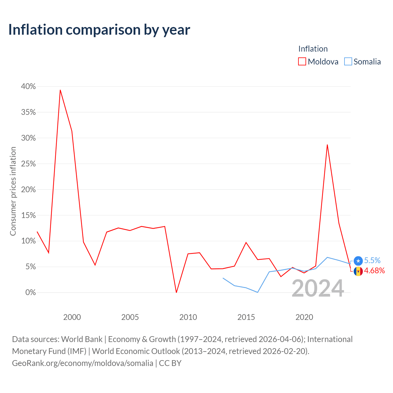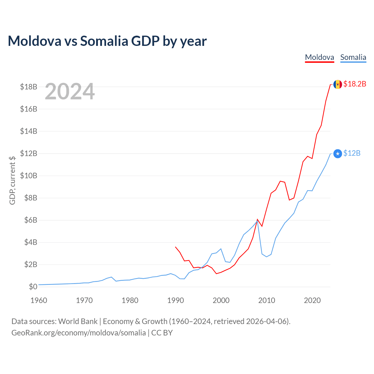 Moldova has a GDP of $18.2B compared to $12B for Somalia, ranking 134/197 and 150/197 by economy size, respectively.