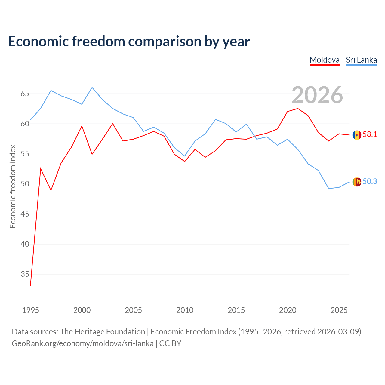 The Economic Freedom Index for Moldova is 58.1, ranking 112/197, compared to 50.3 for Sri Lanka, ranking 162/197. The chart above displays a comparison of annual changes in economic freedom indexes.