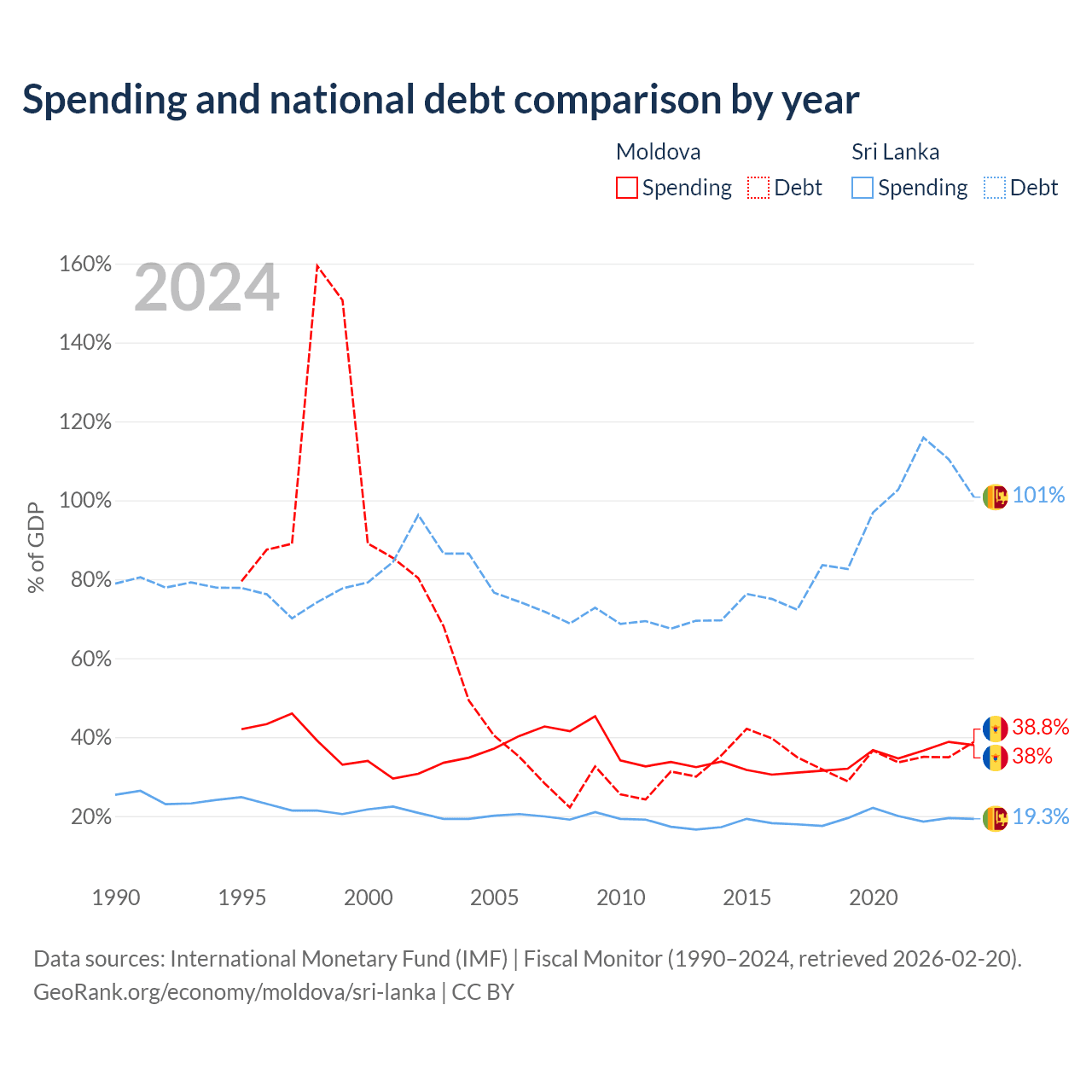 Moldova has $7.06B in government debt (38.8% of GDP), compared to $99.8B (100.8% of GDP) in Sri Lanka.