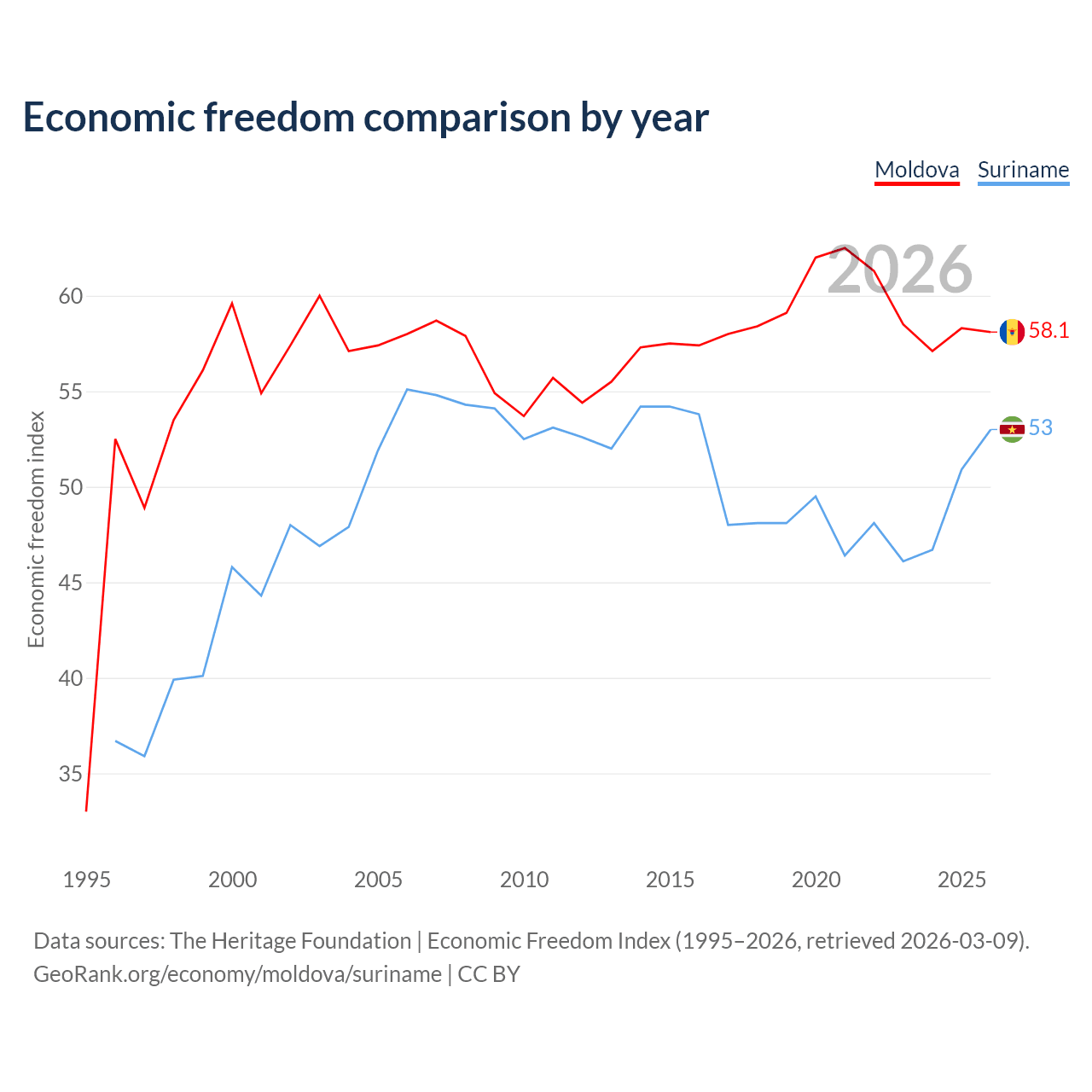 The Economic Freedom Index for Moldova is 58.1, ranking 112/197, compared to 53 for Suriname, ranking 143/197. The chart above displays a comparison of annual changes in economic freedom indexes.