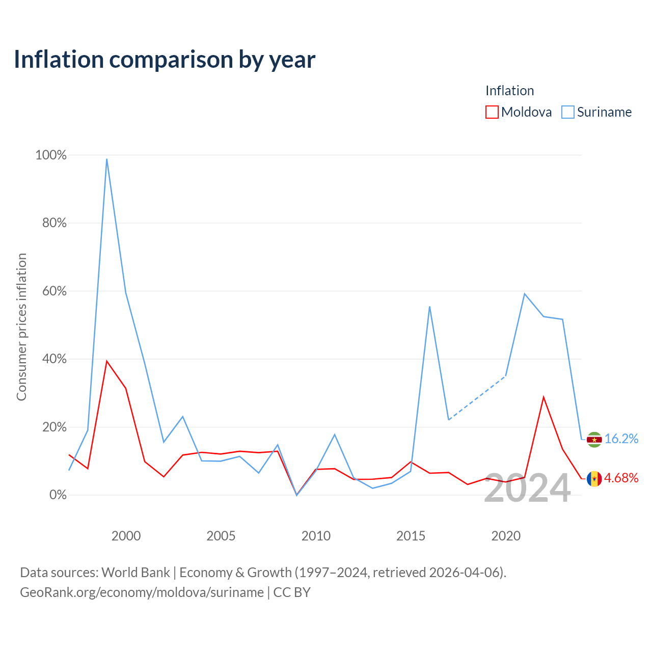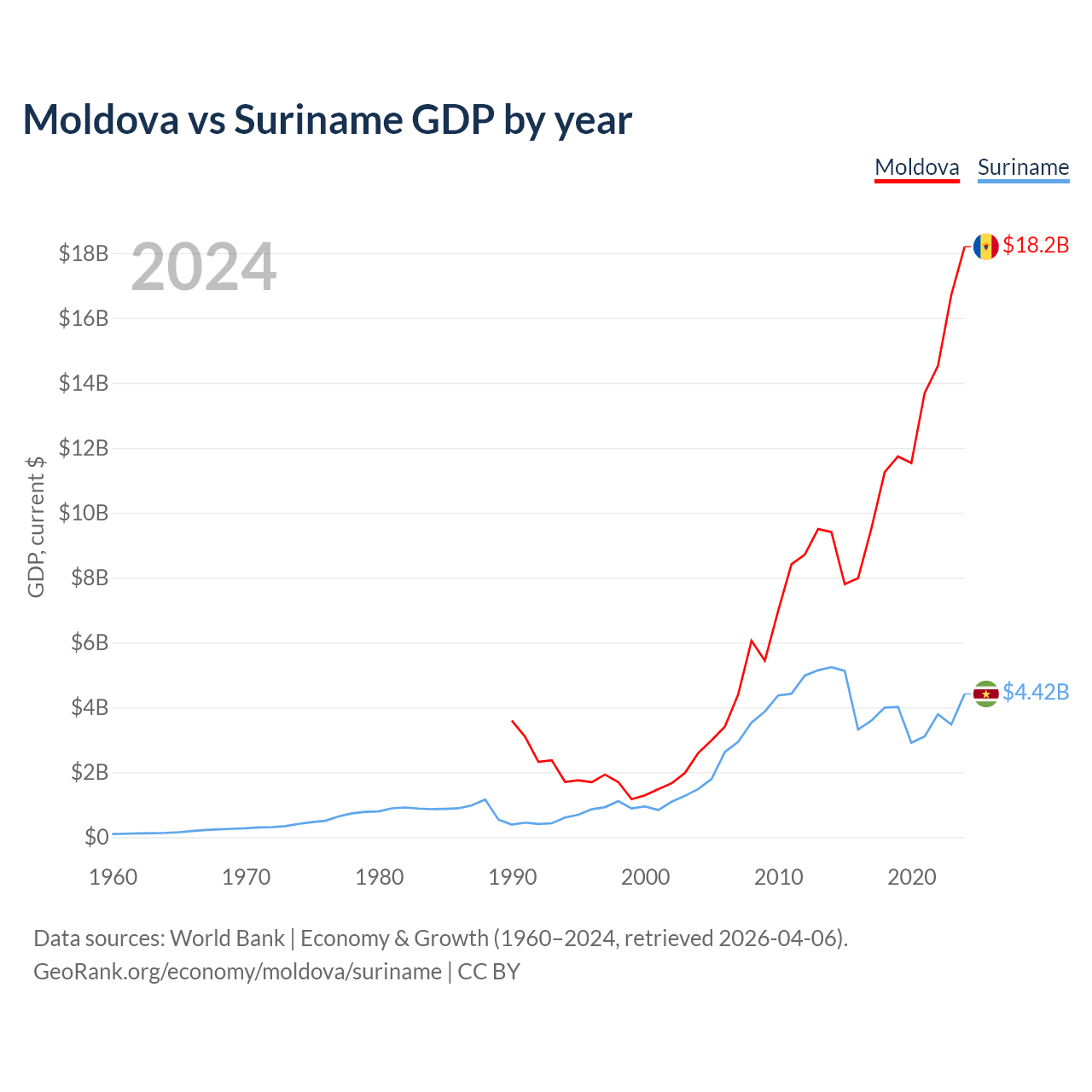 Moldova has a GDP of $18.2B compared to $4.42B for Suriname, ranking 134/197 and 164/197 by economy size, respectively.