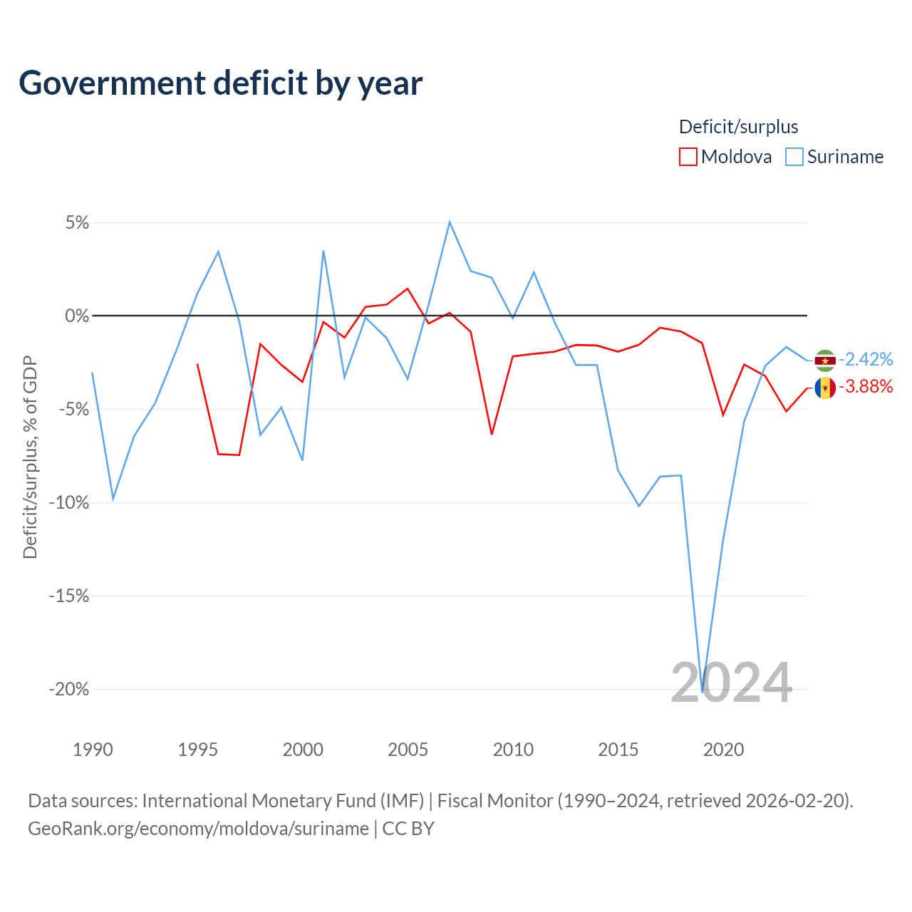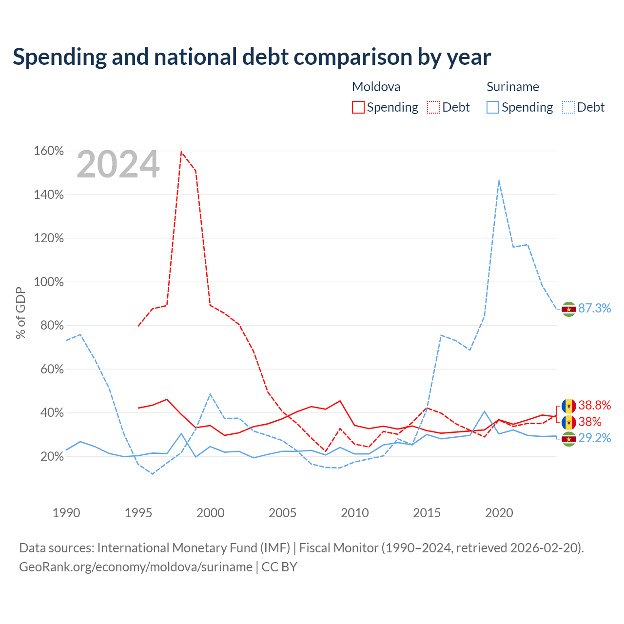 Moldova has $7.06B in government debt (38.8% of GDP), compared to $3.86B (87.3% of GDP) in Suriname.