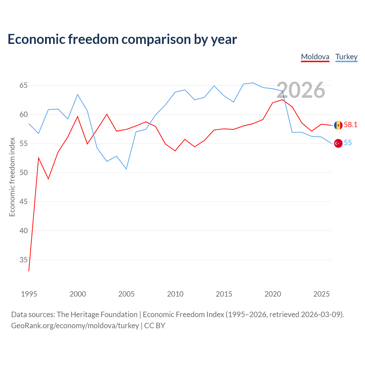 The Economic Freedom Index for Moldova is 58.1, ranking 112/197, compared to 55 for Turkey, ranking 129/197. The chart above displays a comparison of annual changes in economic freedom indexes.