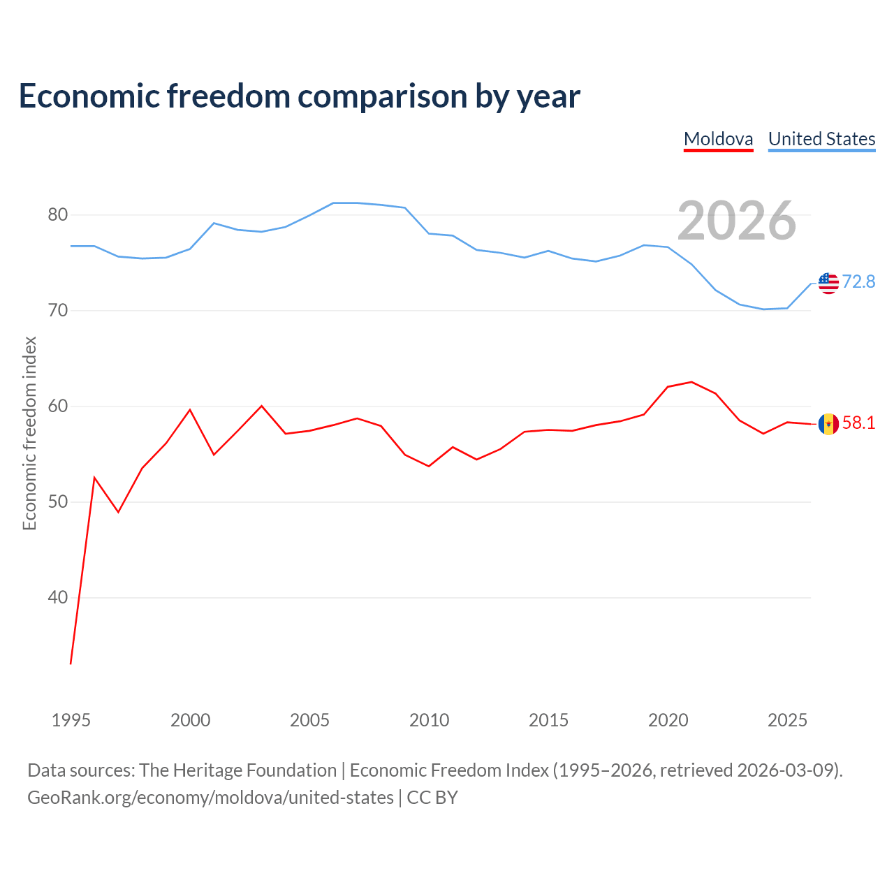 Data sources: The Heritage Foundation | Economic Freedom Index (1995–2026, retrieved 2026-03-09).