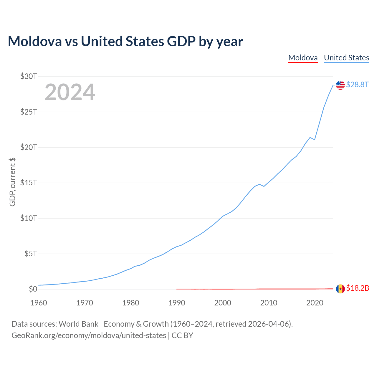 Moldova has a GDP of $18.2B compared to $28.8T for the United States, ranking 134/197 and 1/197 by economy size, respectively.