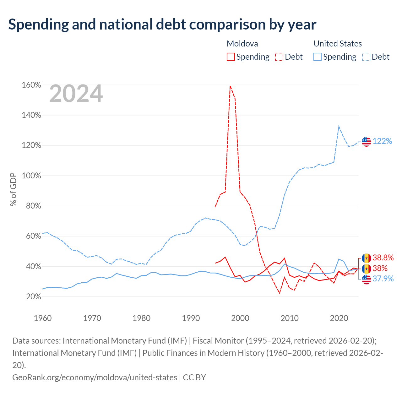 Moldova has $7.06B in government debt (38.8% of GDP), compared to $35.2T (122.3% of GDP) in the United States.