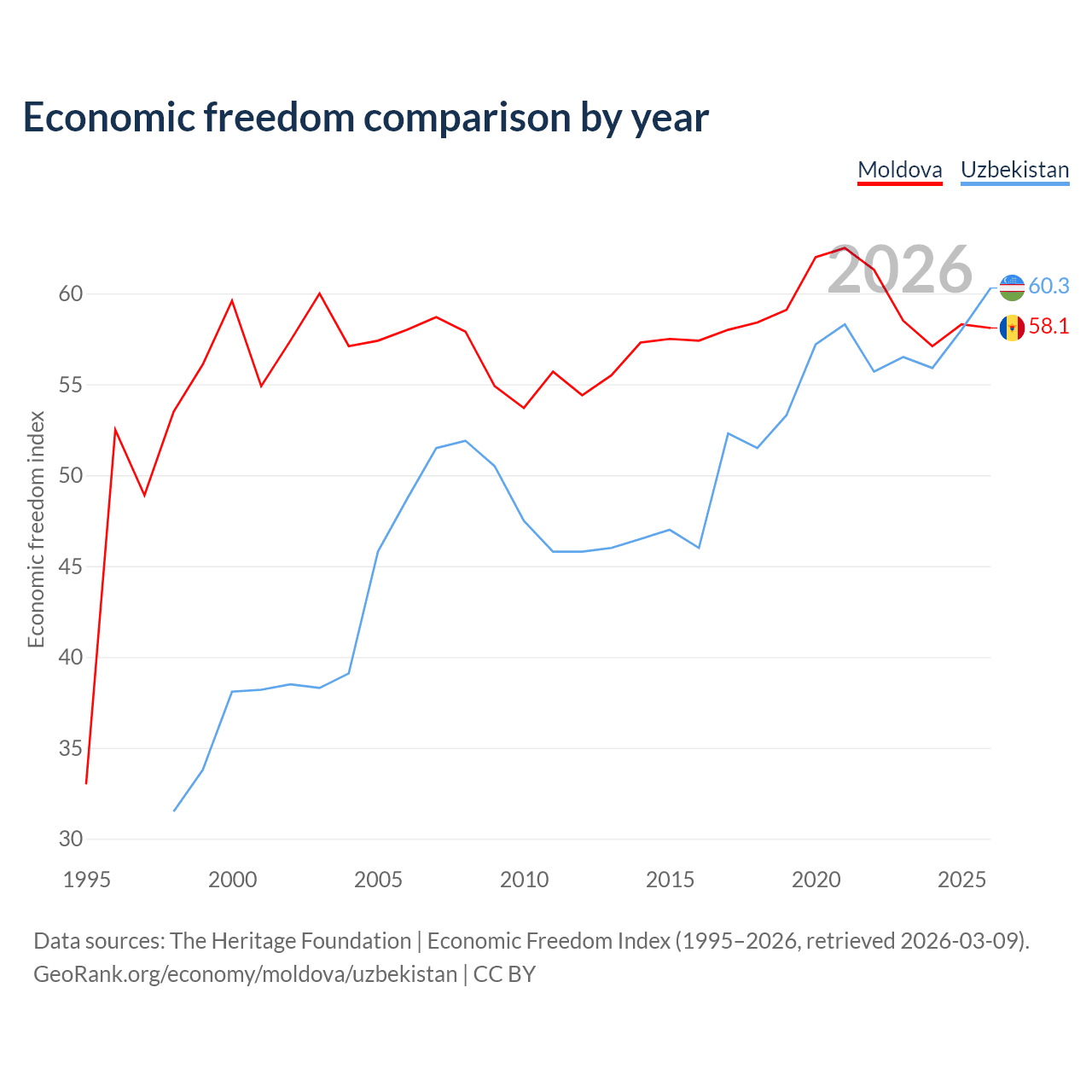 The Economic Freedom Index for Moldova is 58.1, ranking 112/197, compared to 60.3 for Uzbekistan, ranking 94/197. The chart above displays a comparison of annual changes in economic freedom indexes.