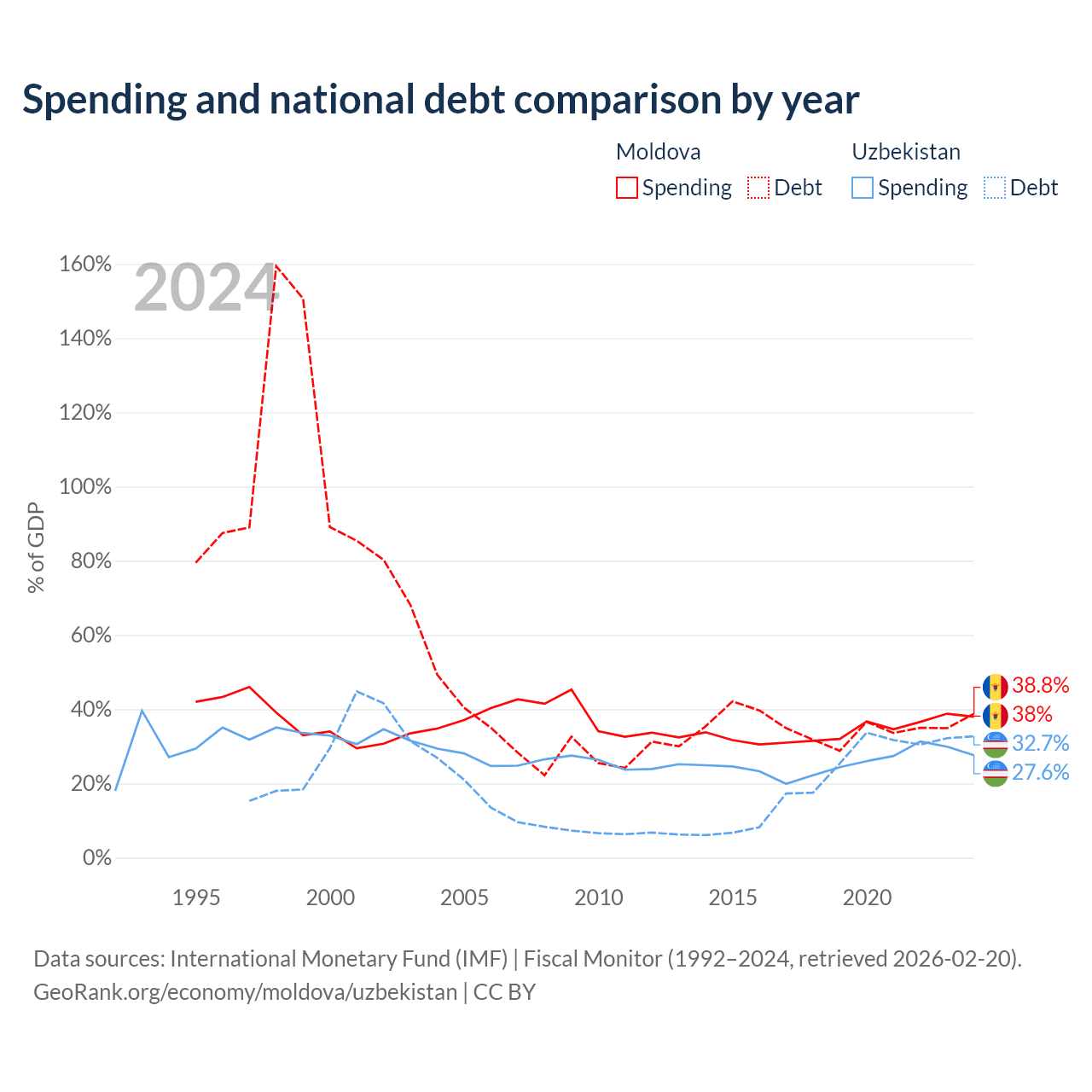 Moldova has $7.06B in government debt (38.8% of GDP), compared to $37.5B (32.7% of GDP) in Uzbekistan.