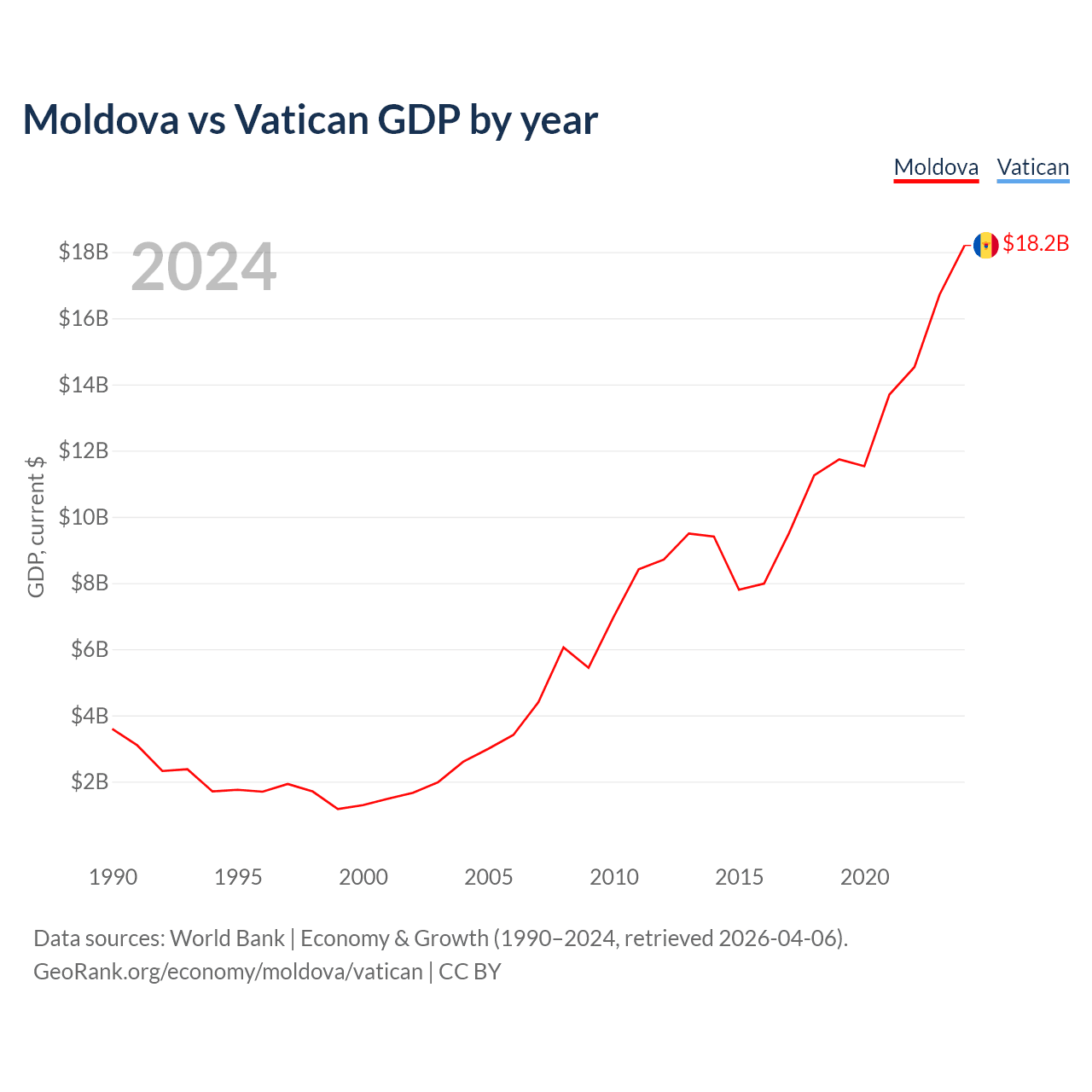 Moldova has a GDP of $18.2B compared to $19.8M for the Vatican, ranking 134/197 and 197/197 by economy size, respectively.