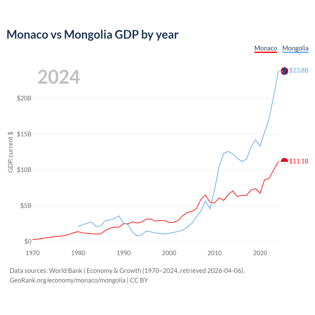 Monaco has a GDP of $11.1B compared to $23.8B for Mongolia, ranking 152/197 and 121/197 by economy size, respectively.