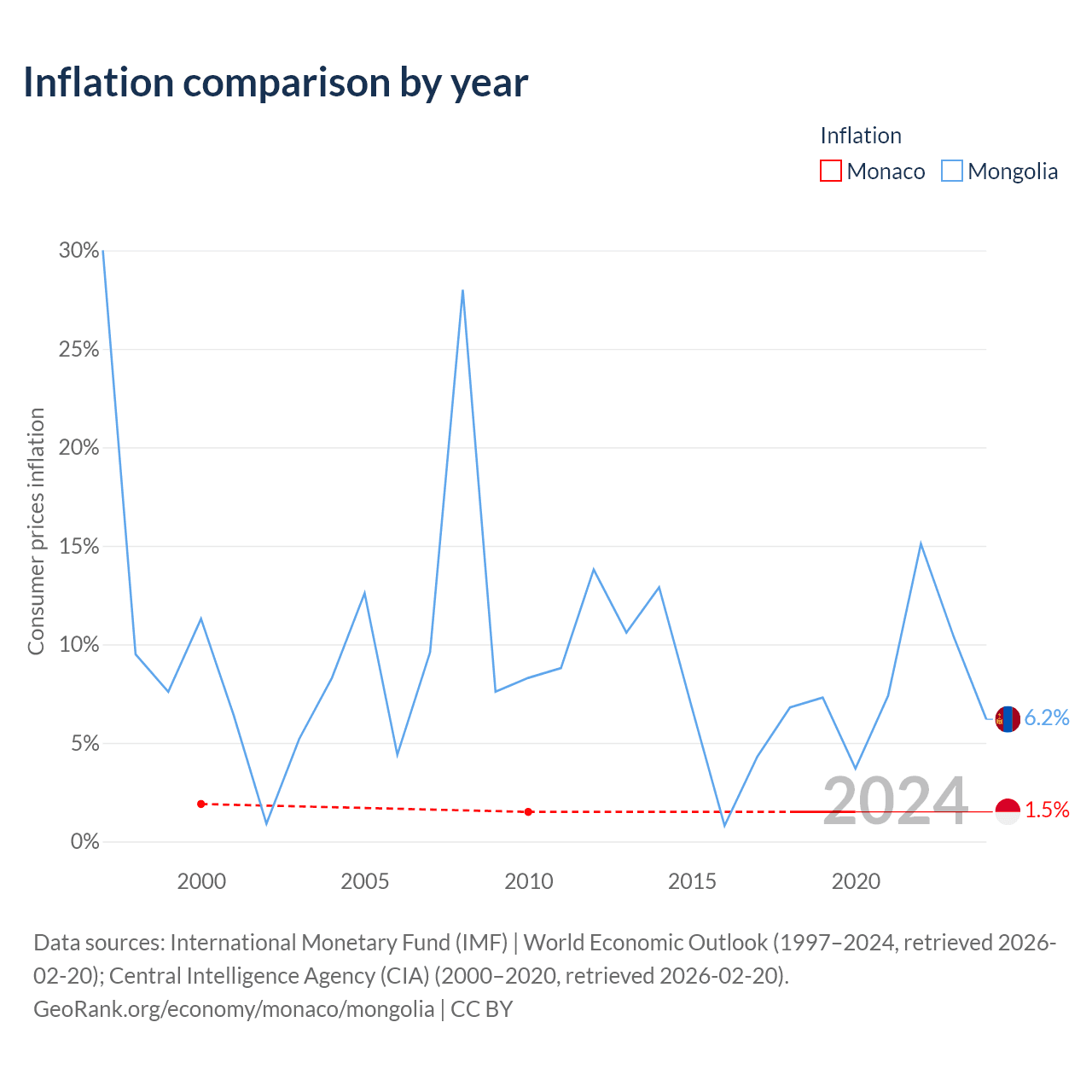 Over the past 21 years, Monaco has recorded an average annual inflation rate of 1.58%, compared with 8.5% in Mongolia. In 2020, inflation was 1.5% in Monaco and 6.2% in Mongolia.
