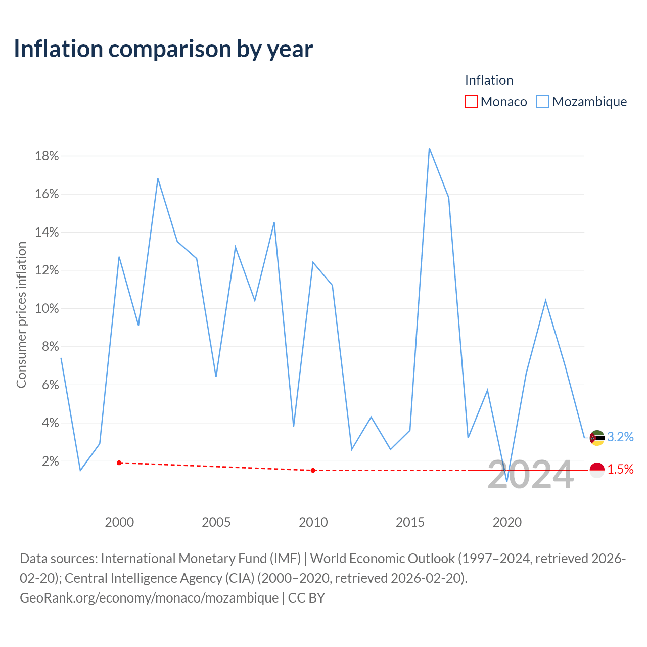 Over the past 21 years, Monaco has recorded an average annual inflation rate of 1.58%, compared with 9.22% in Mozambique. In 2020, inflation was 1.5% in Monaco and 3.2% in Mozambique.