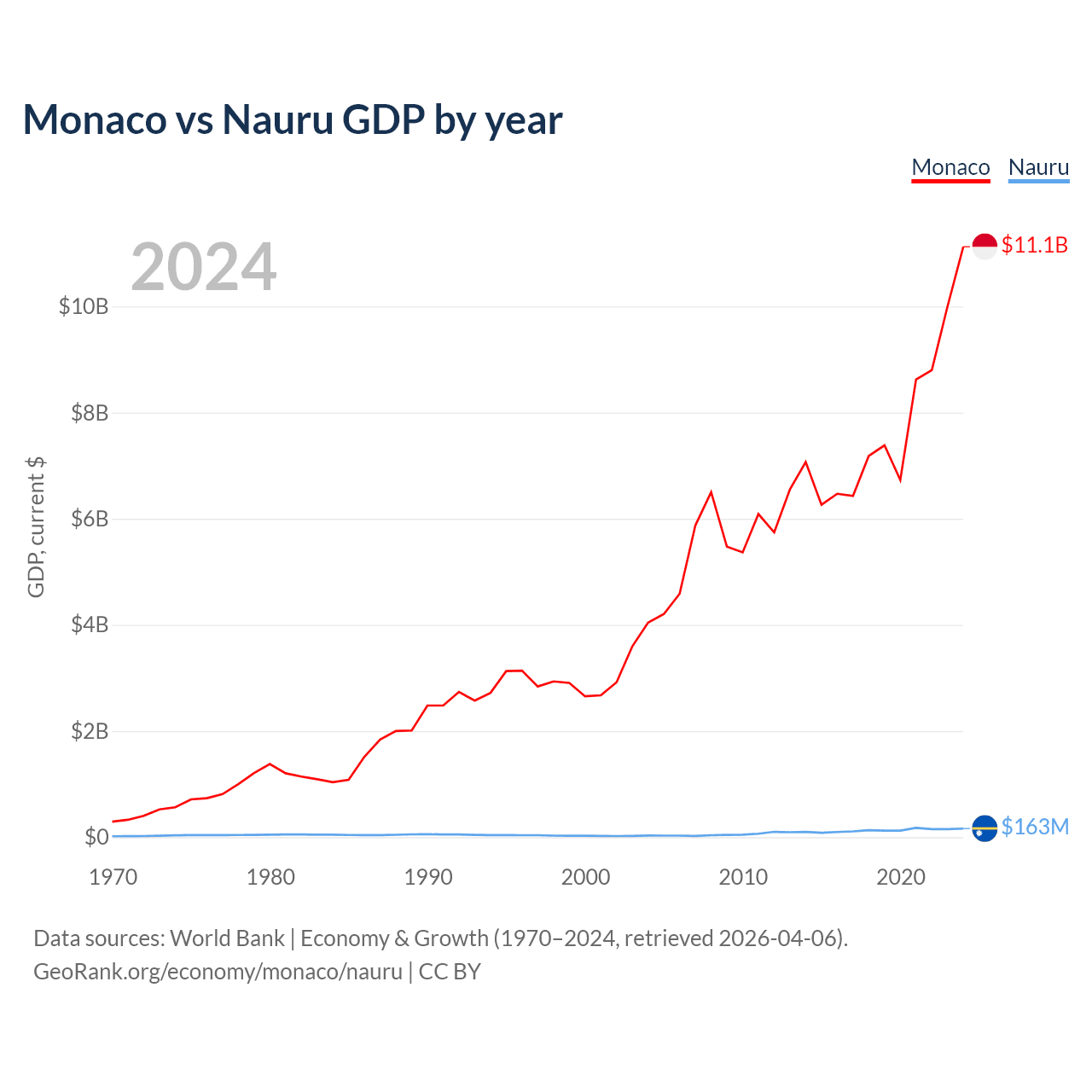 Monaco has a GDP of $11.1B compared to $163M for Nauru, ranking 152/197 and 195/197 by economy size, respectively.