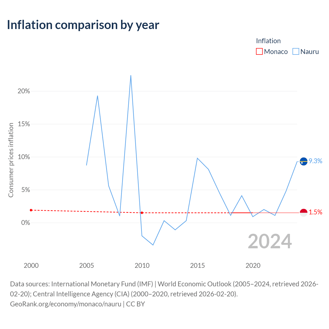 Over the past 16 years, Monaco has recorded an average annual inflation rate of 1.5%, compared with 4.97% in Nauru. In 2020, inflation was 1.5% in Monaco and 9.3% in Nauru.