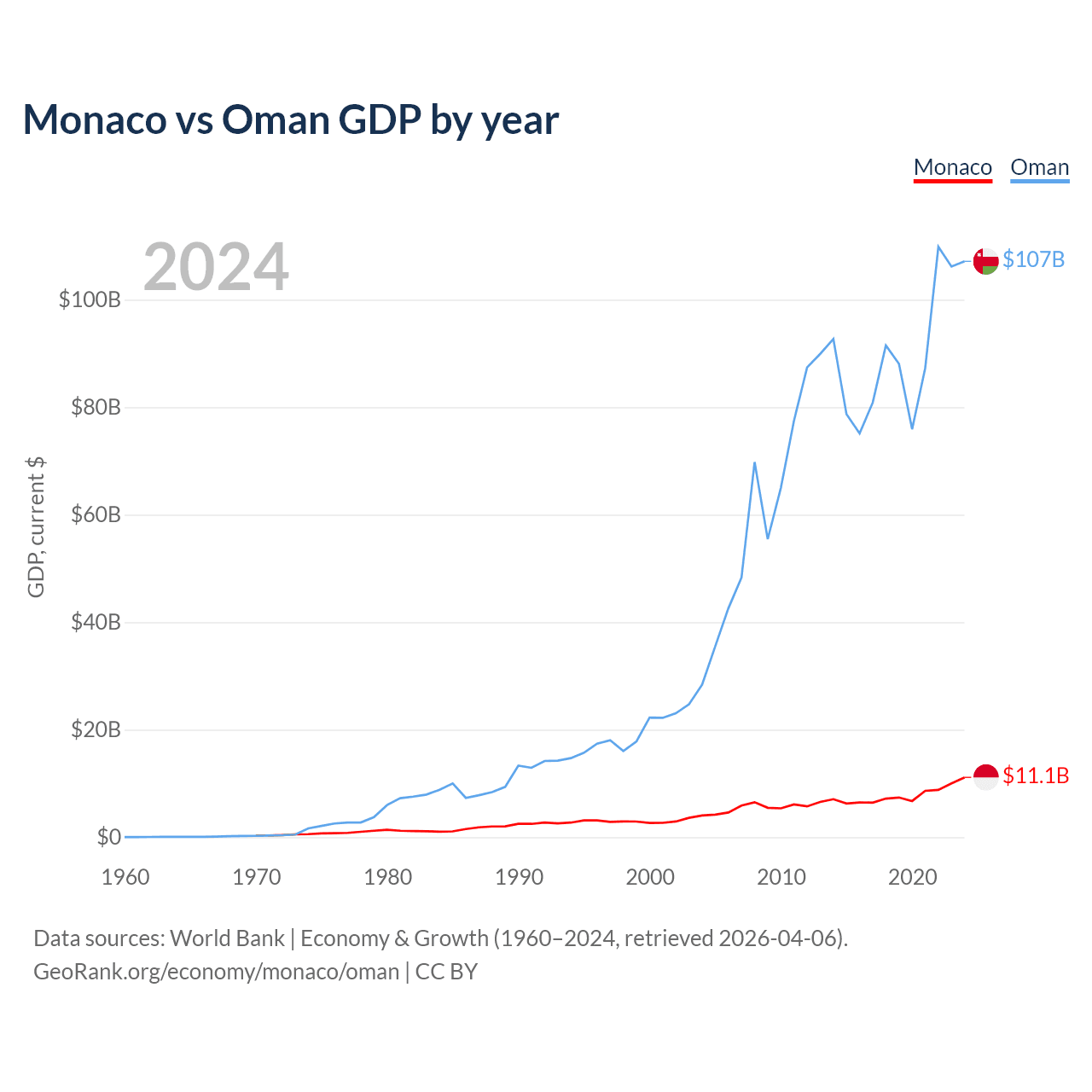 Monaco has a GDP of $11.1B compared to $107B for Oman, ranking 152/197 and 70/197 by economy size, respectively.
