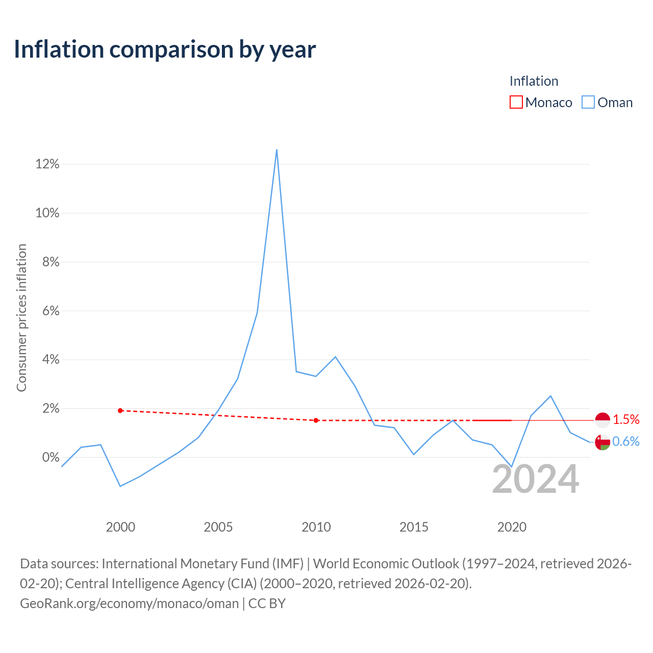 Over the past 21 years, Monaco has recorded an average annual inflation rate of 1.58%, compared with 2% in Oman. In 2020, inflation was 1.5% in Monaco and 0.6% in Oman.