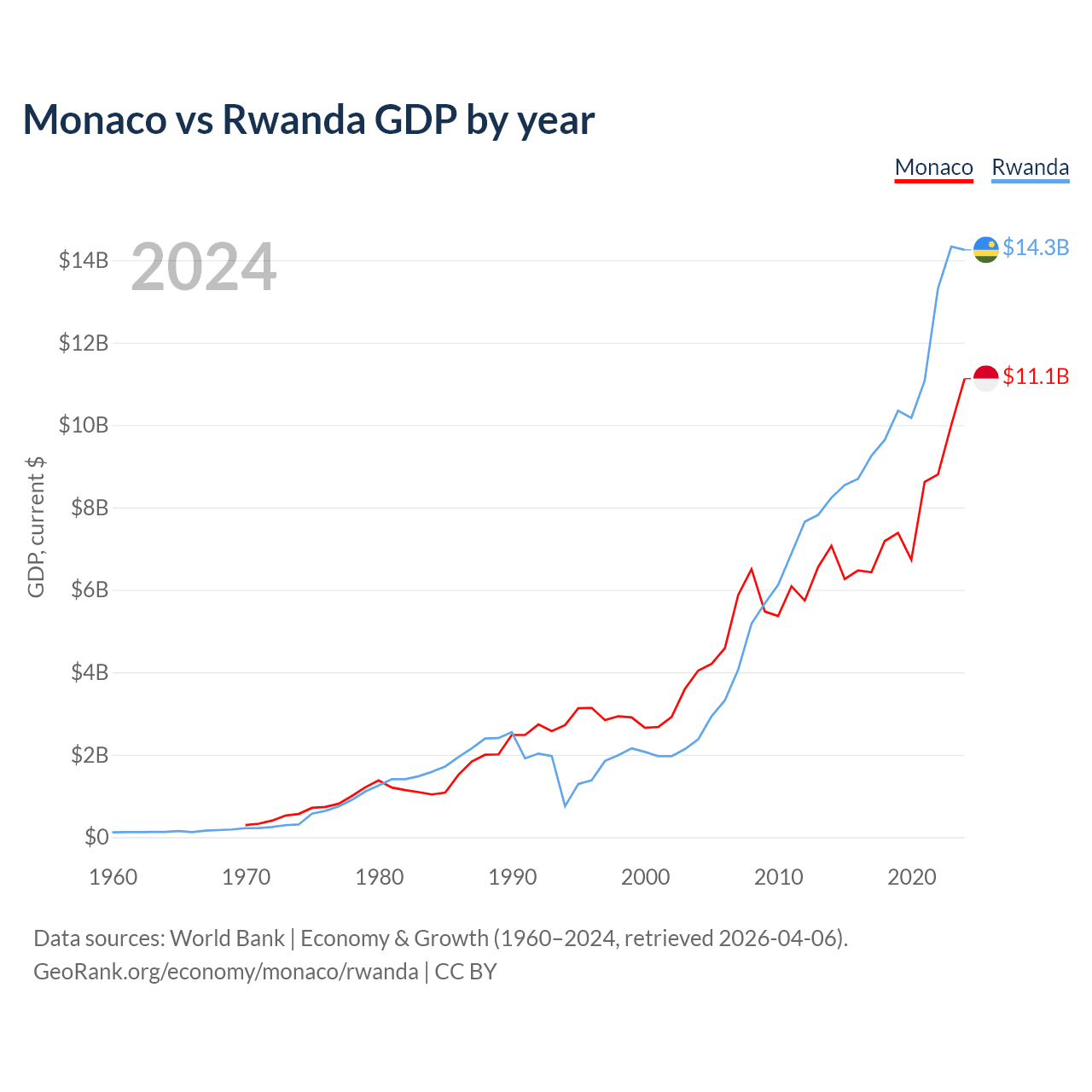 Monaco has a GDP of $11.1B compared to $14.3B for Rwanda, ranking 152/197 and 144/197 by economy size, respectively.