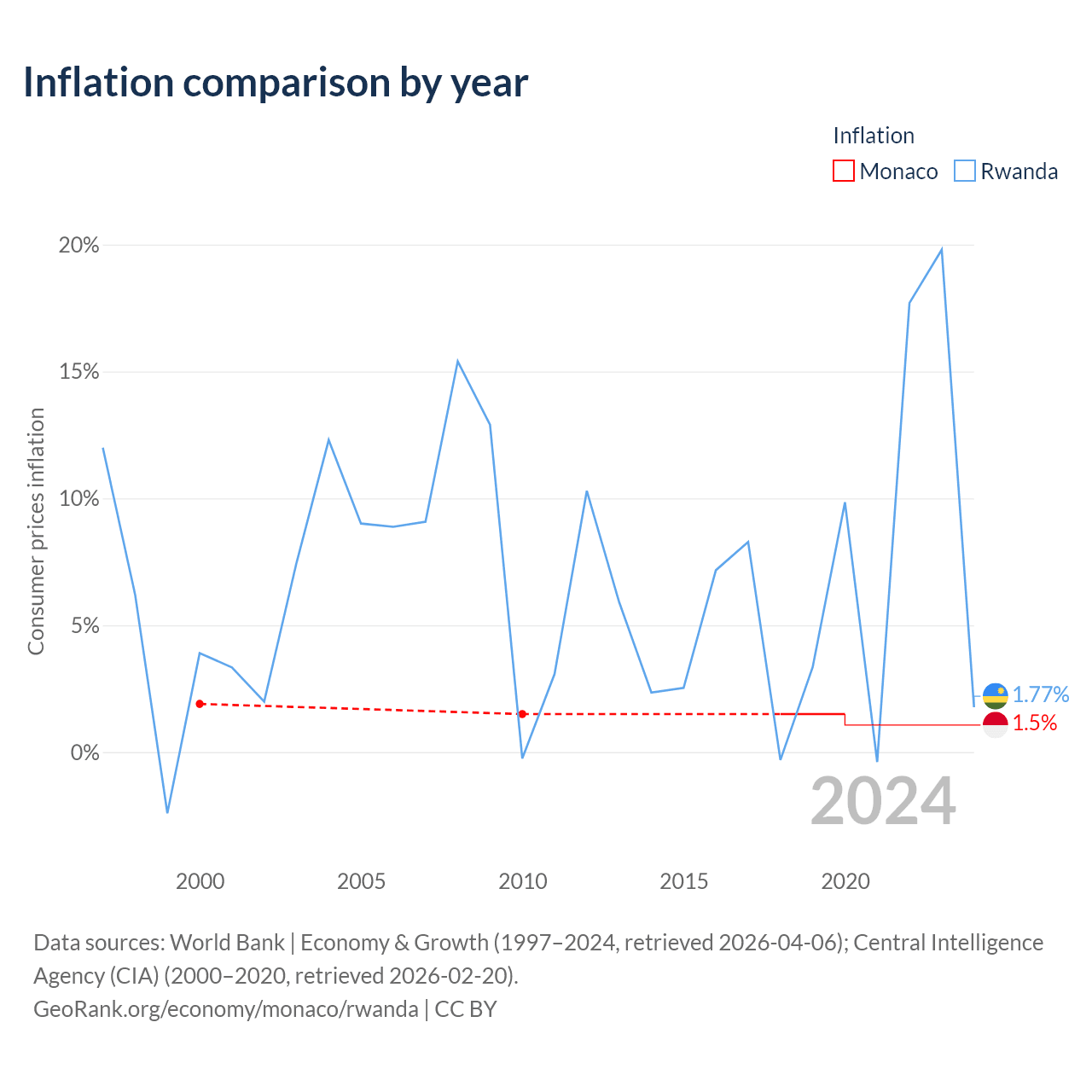 Over the past 21 years, Monaco has recorded an average annual inflation rate of 1.58%, compared with 6.5% in Rwanda. In 2020, inflation was 1.5% in Monaco and 1.77% in Rwanda.
