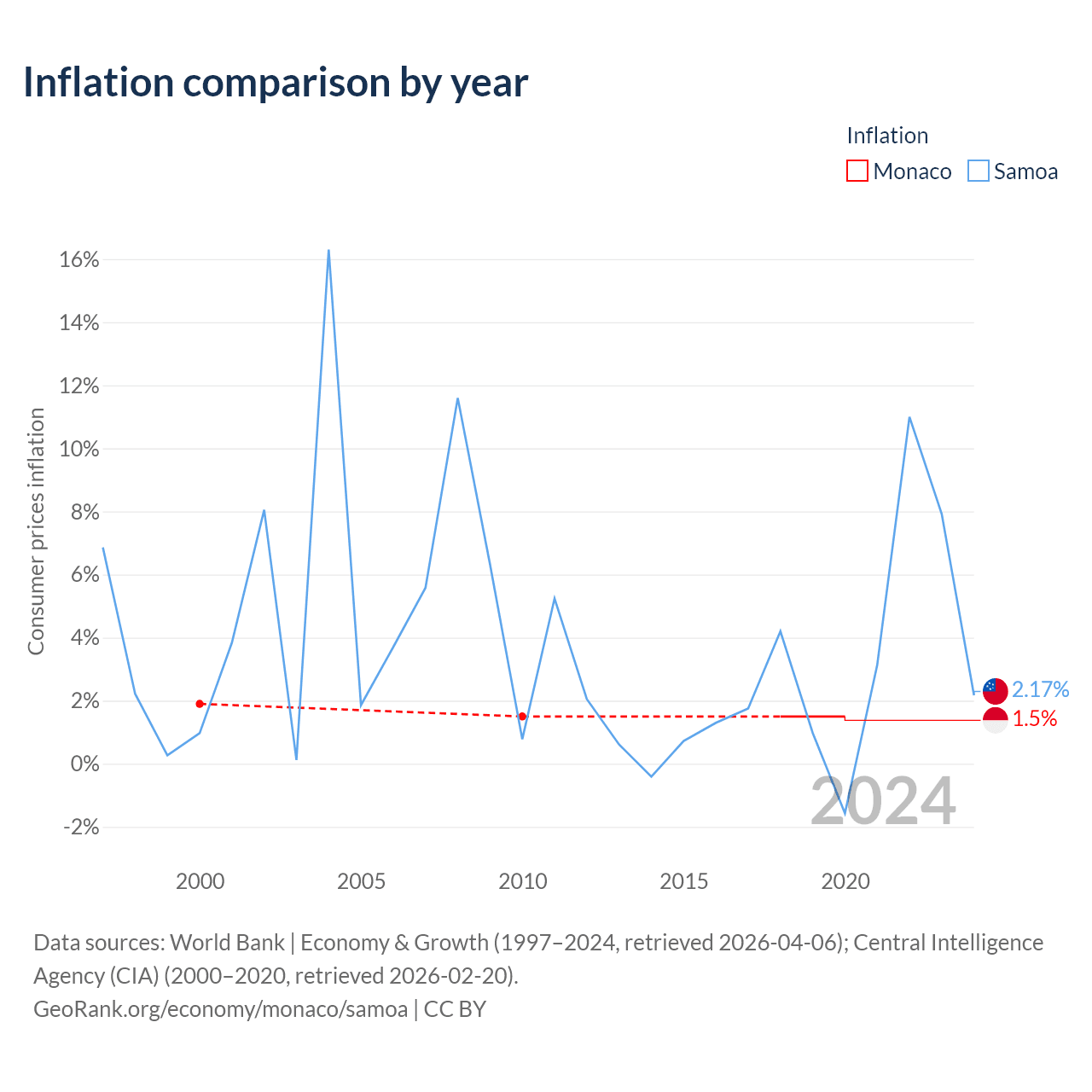 Over the past 21 years, Monaco has recorded an average annual inflation rate of 1.58%, compared with 3.52% in Samoa. In 2020, inflation was 1.5% in Monaco and 2.17% in Samoa.