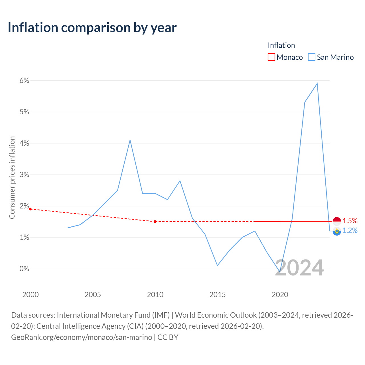 Over the past 18 years, Monaco has recorded an average annual inflation rate of 1.5%, compared with 1.61% in San Marino. In 2020, inflation was 1.5% in Monaco and 1.2% in San Marino.
