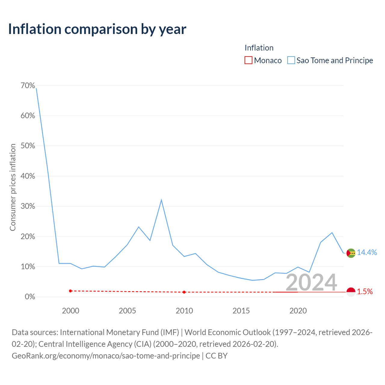 Over the past 21 years, Monaco has recorded an average annual inflation rate of 1.58%, compared with 12.2% in Sao Tome and Principe. In 2020, inflation was 1.5% in Monaco and 14.4% in Sao Tome and Principe.