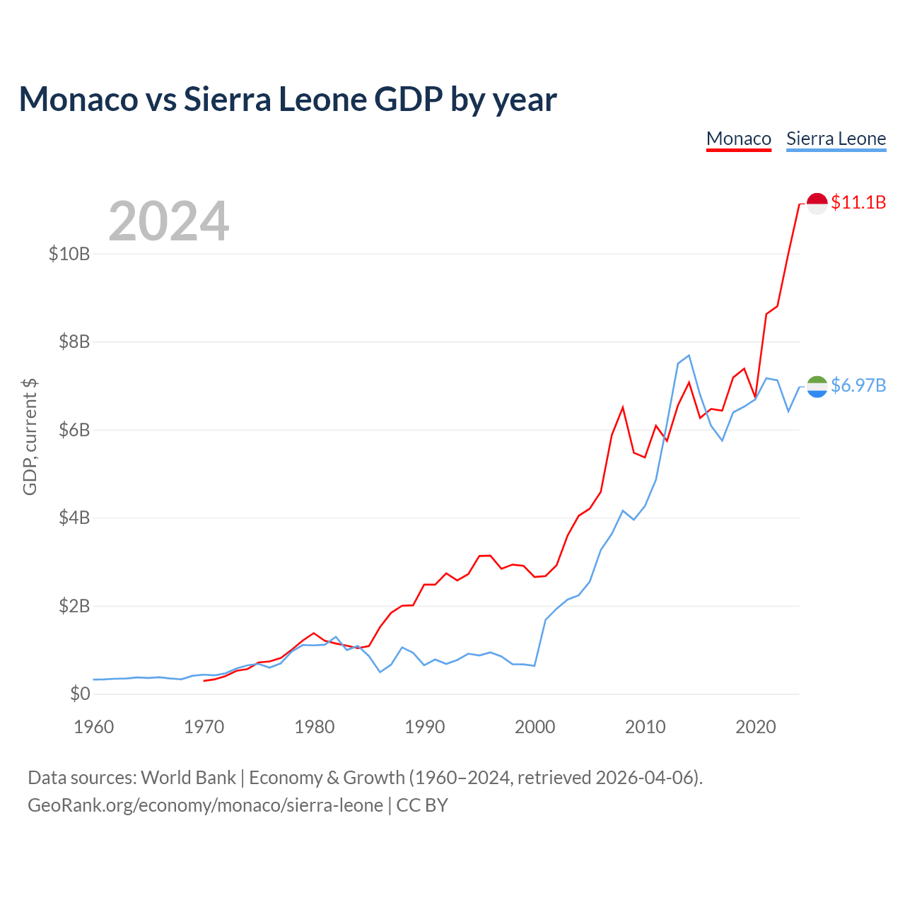 Monaco has a GDP of $11.1B compared to $6.97B for Sierra Leone, ranking 152/197 and 160/197 by economy size, respectively.