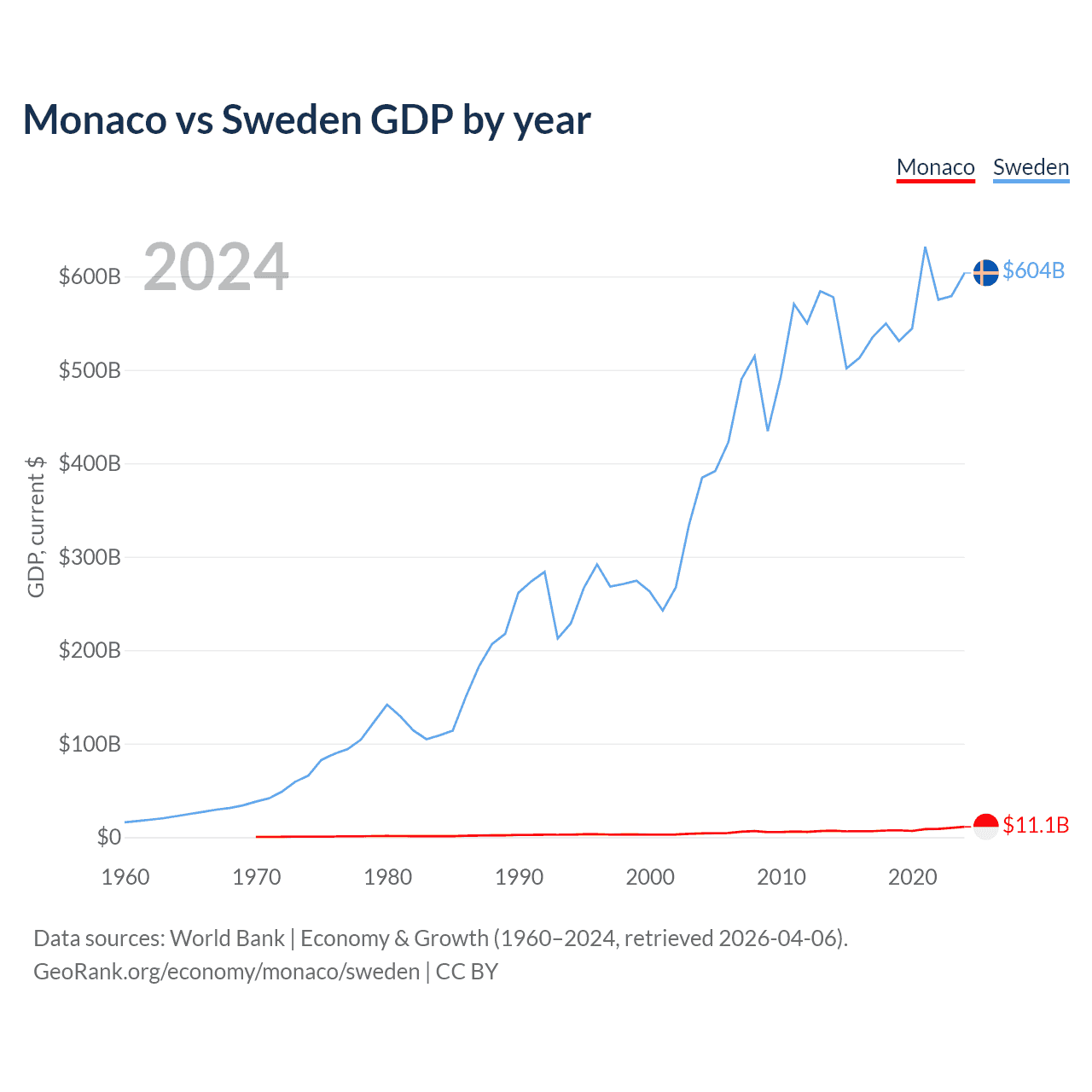 Monaco has a GDP of $11.1B compared to $604B for Sweden, ranking 152/197 and 26/197 by economy size, respectively.