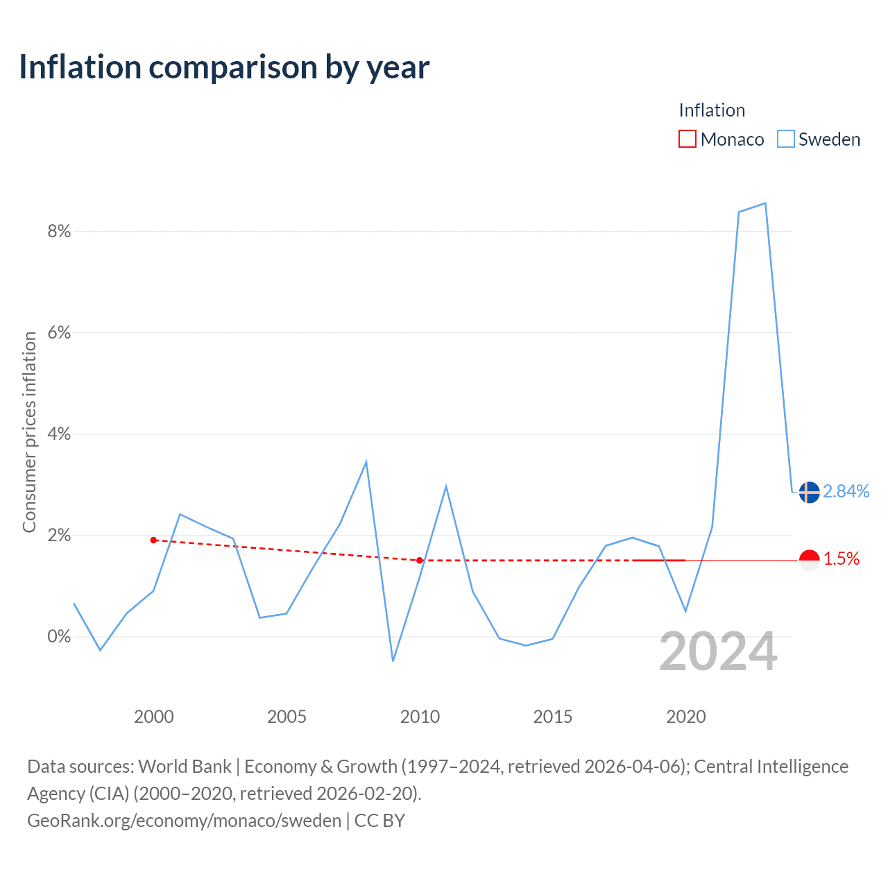 Over the past 21 years, Monaco has recorded an average annual inflation rate of 1.58%, compared with 1.26% in Sweden. In 2020, inflation was 1.5% in Monaco and 2.84% in Sweden.
