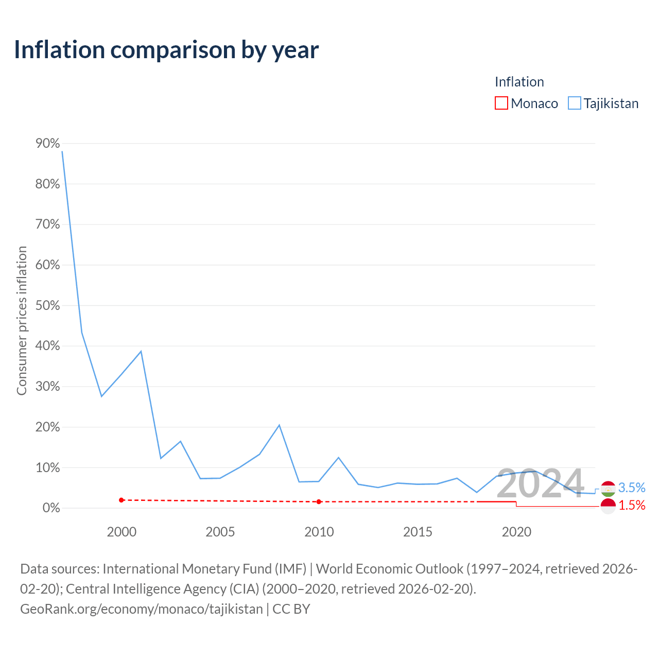 Over the past 21 years, Monaco has recorded an average annual inflation rate of 1.58%, compared with 11.4% in Tajikistan. In 2020, inflation was 1.5% in Monaco and 3.5% in Tajikistan.