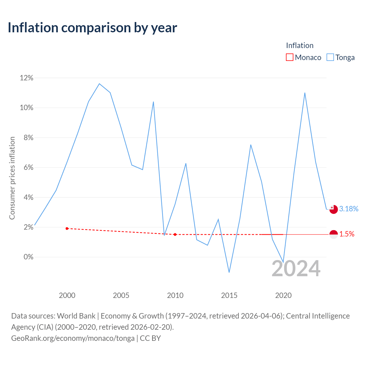 Over the past 21 years, Monaco has recorded an average annual inflation rate of 1.58%, compared with 5.2% in Tonga. In 2020, inflation was 1.5% in Monaco and 3.18% in Tonga.