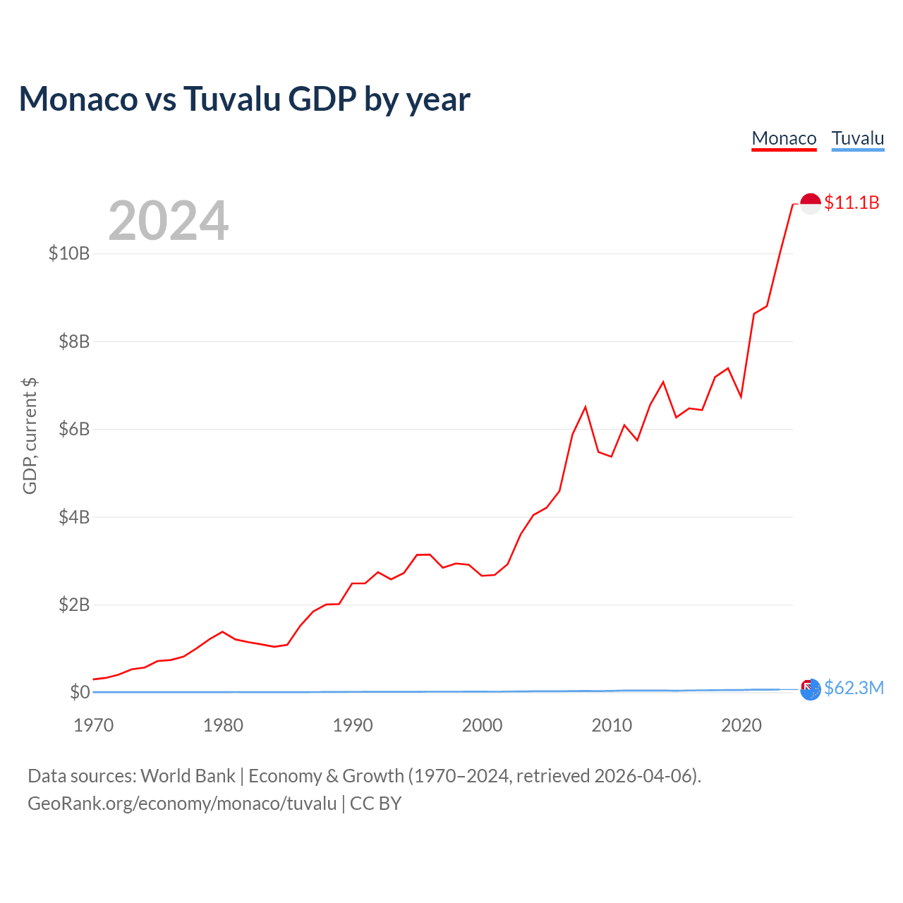 Monaco has a GDP of $11.1B compared to $62.3M for Tuvalu, ranking 152/197 and 196/197 by economy size, respectively.
