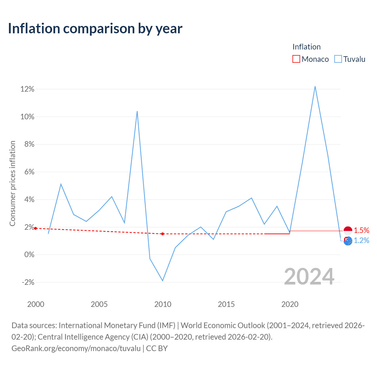 Over the past 20 years, Monaco has recorded an average annual inflation rate of 1.5%, compared with 2.64% in Tuvalu. In 2020, inflation was 1.5% in Monaco and 1.2% in Tuvalu.