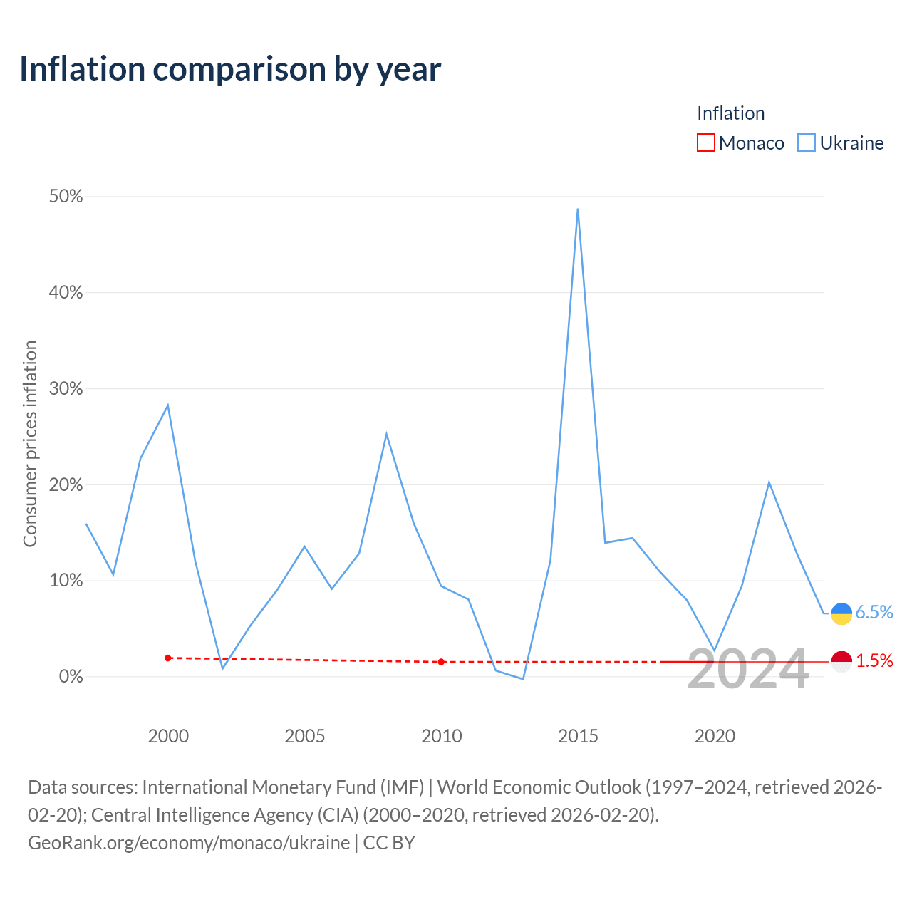 Over the past 21 years, Monaco has recorded an average annual inflation rate of 1.58%, compared with 12.4% in Ukraine. In 2020, inflation was 1.5% in Monaco and 6.5% in Ukraine.