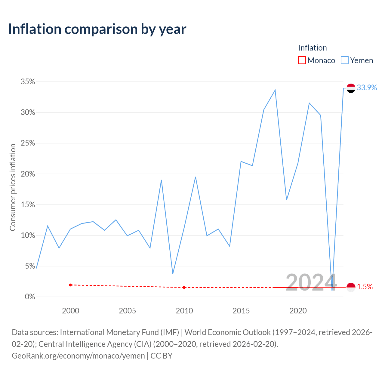 Over the past 21 years, Monaco has recorded an average annual inflation rate of 1.58%, compared with 15% in Yemen. In 2020, inflation was 1.5% in Monaco and 33.9% in Yemen.