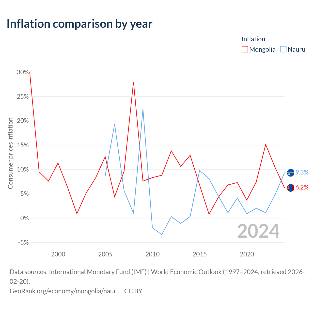 Over the past 20 years, Mongolia has recorded an average annual inflation rate of 9.27%, compared with 4.84% in Nauru. In 2024, inflation was 6.2% in Mongolia and 9.3% in Nauru.