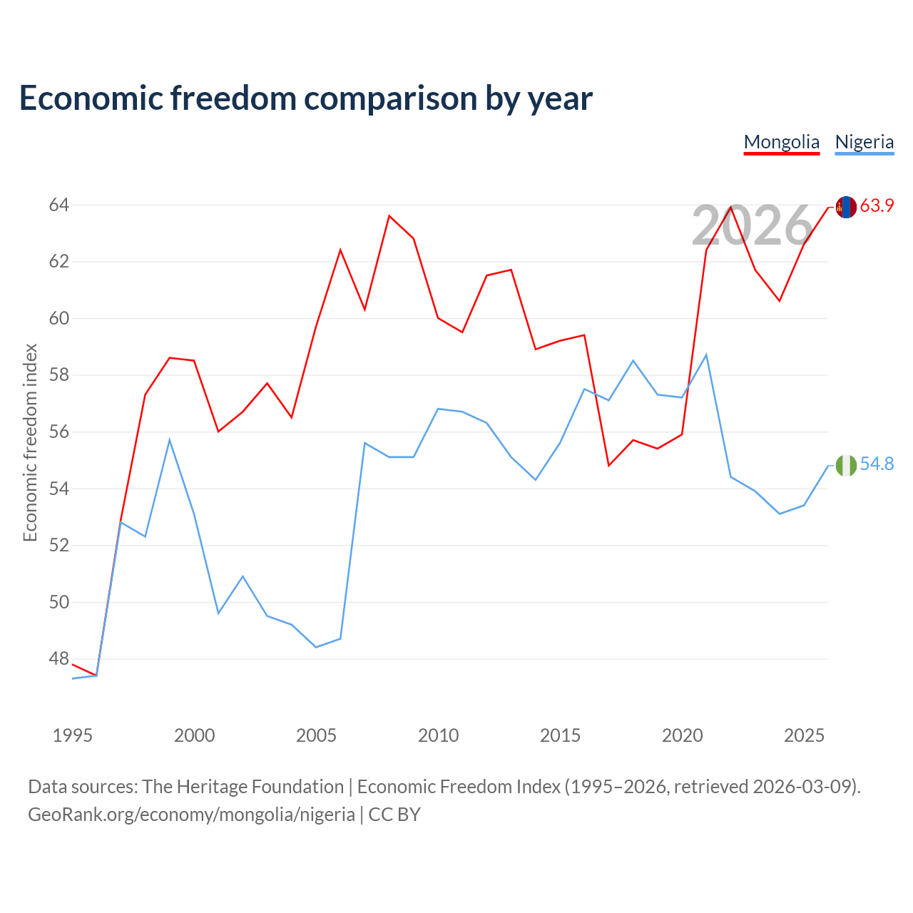 The Economic Freedom Index for Mongolia is 63.9, ranking 76/197, compared to 54.8 for Nigeria, ranking 132/197. The chart above displays a comparison of annual changes in economic freedom indexes.