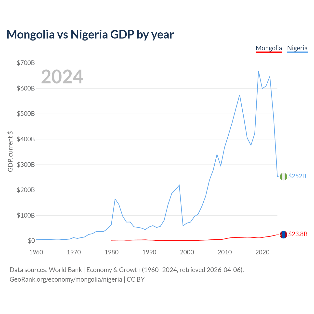 Mongolia has a GDP of $23.8B compared to $252B for Nigeria, ranking 121/197 and 54/197 by economy size, respectively.