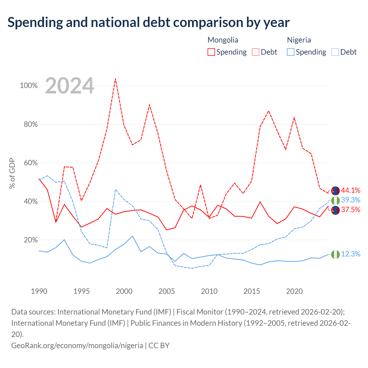 Mongolia has $10.5B in government debt (44.1% of GDP), compared to $99.2B (39.3% of GDP) in Nigeria.