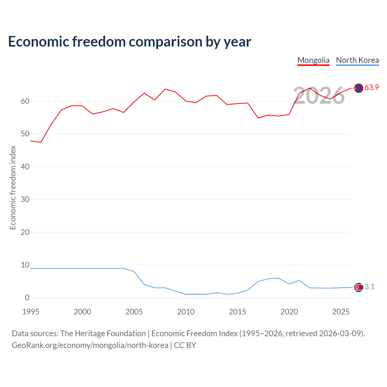 Data sources: The Heritage Foundation | Economic Freedom Index (1995–2026, retrieved 2026-03-09).