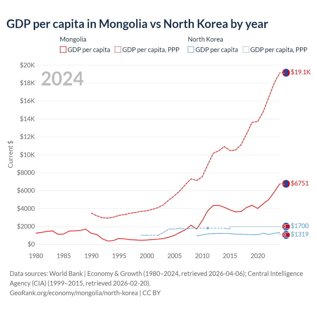 GDP per capita in Mongolia vs North Korea by year