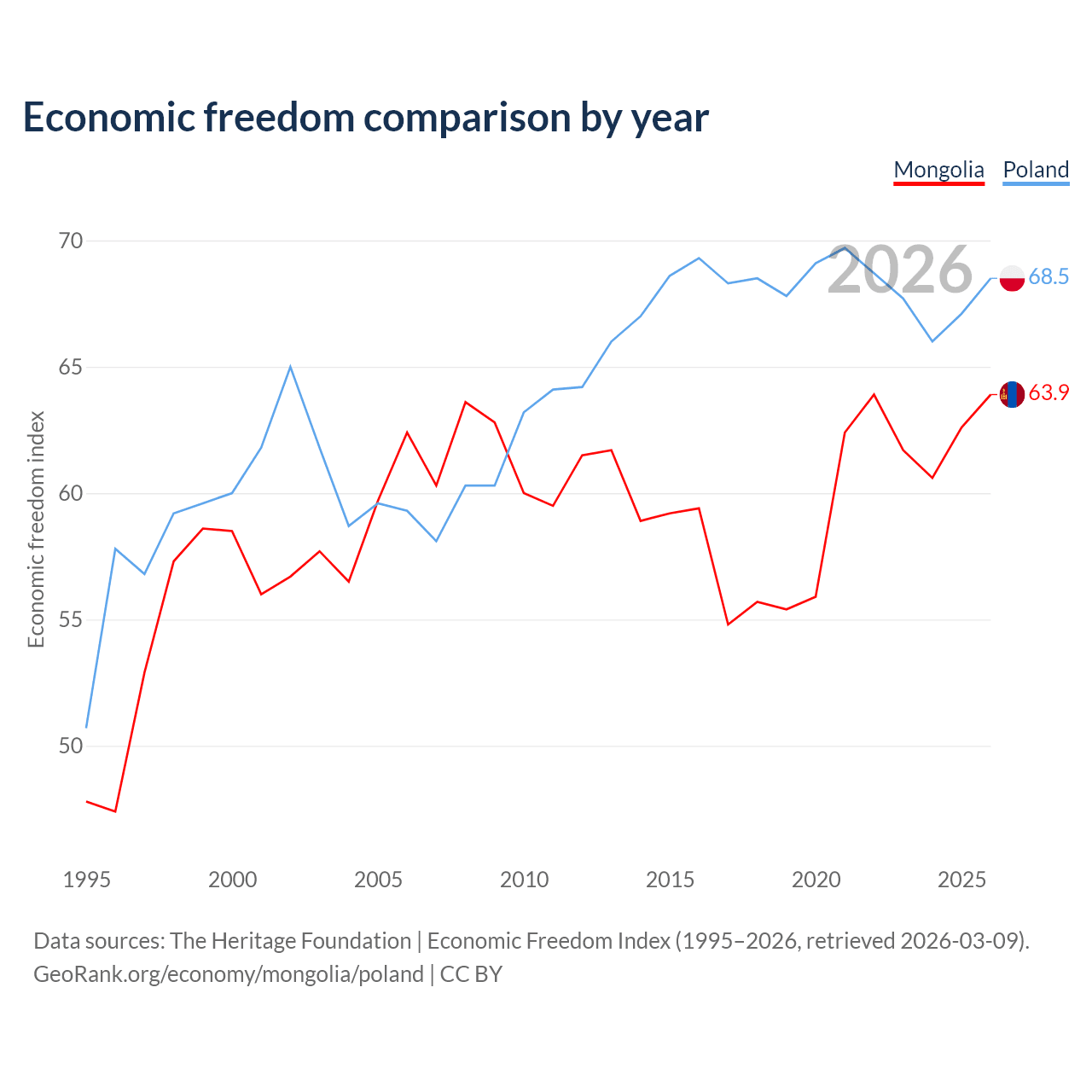 The Economic Freedom Index for Mongolia is 63.9, ranking 76/197, compared to 68.5 for Poland, ranking 46/197. The chart above displays a comparison of annual changes in economic freedom indexes.