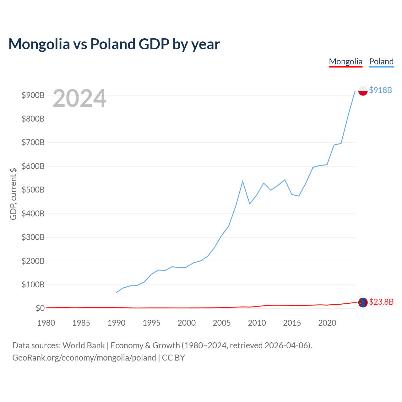 Mongolia has a GDP of $23.8B compared to $918B for Poland, ranking 121/197 and 21/197 by economy size, respectively.