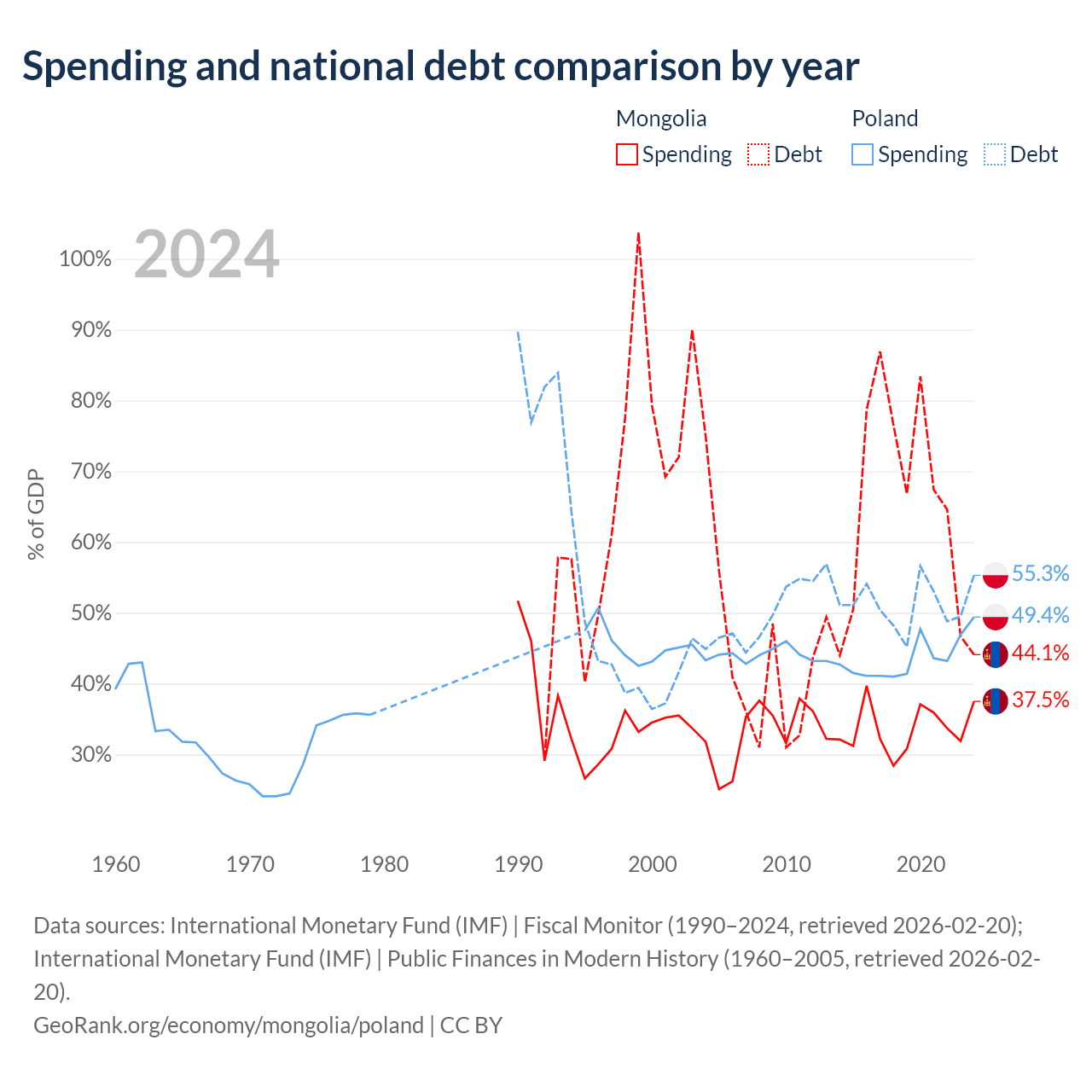 Mongolia has $10.5B in government debt (44.1% of GDP), compared to $507B (55.3% of GDP) in Poland.