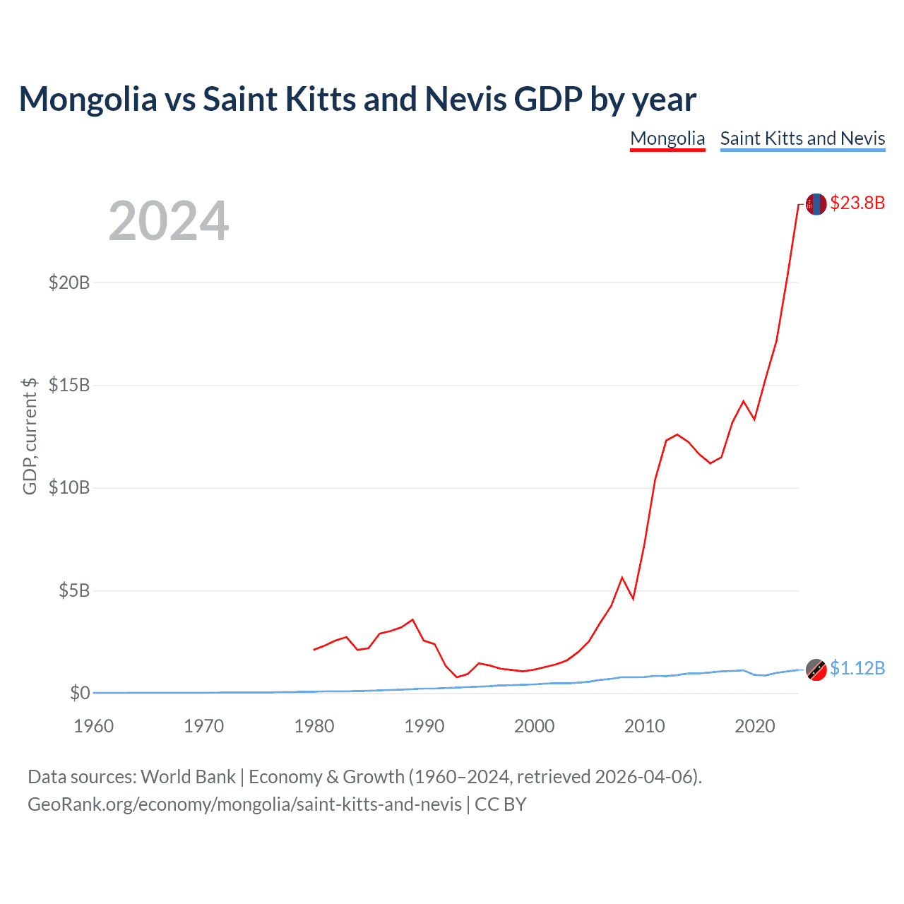 Mongolia has a GDP of $23.8B compared to $1.12B for Saint Kitts and Nevis, ranking 121/197 and 187/197 by economy size, respectively.