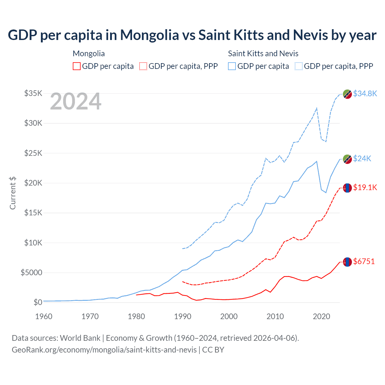 GDP per capita in Mongolia vs Saint Kitts and Nevis by year
