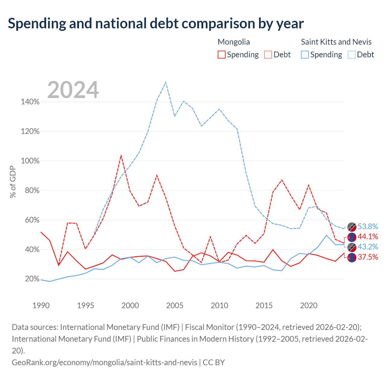 Mongolia has $10.5B in government debt (44.1% of GDP), compared to $604M (53.8% of GDP) in Saint Kitts and Nevis.