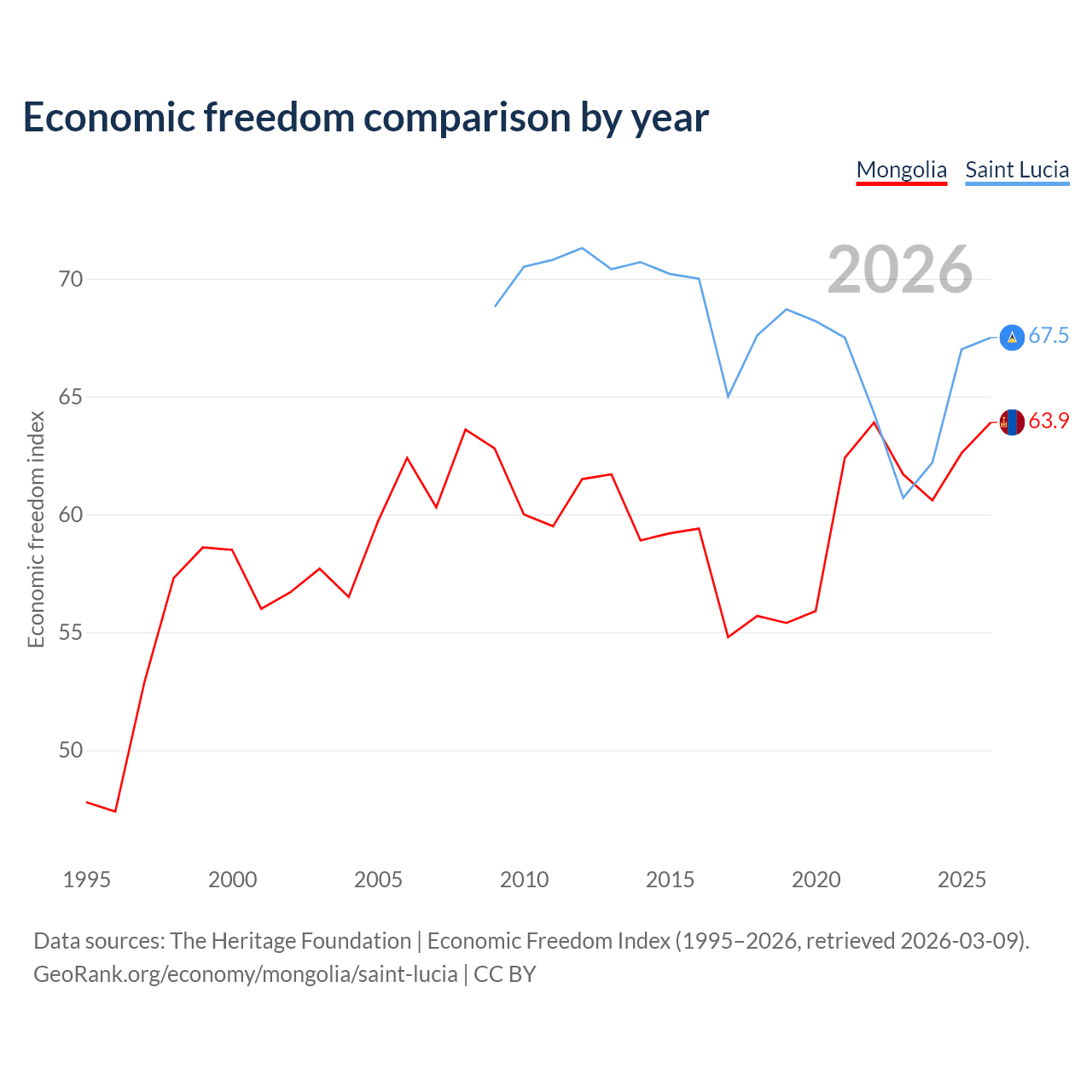 The Economic Freedom Index for Mongolia is 63.9, ranking 76/197, compared to 67.5 for Saint Lucia, ranking 57/197. The chart above displays a comparison of annual changes in economic freedom indexes.