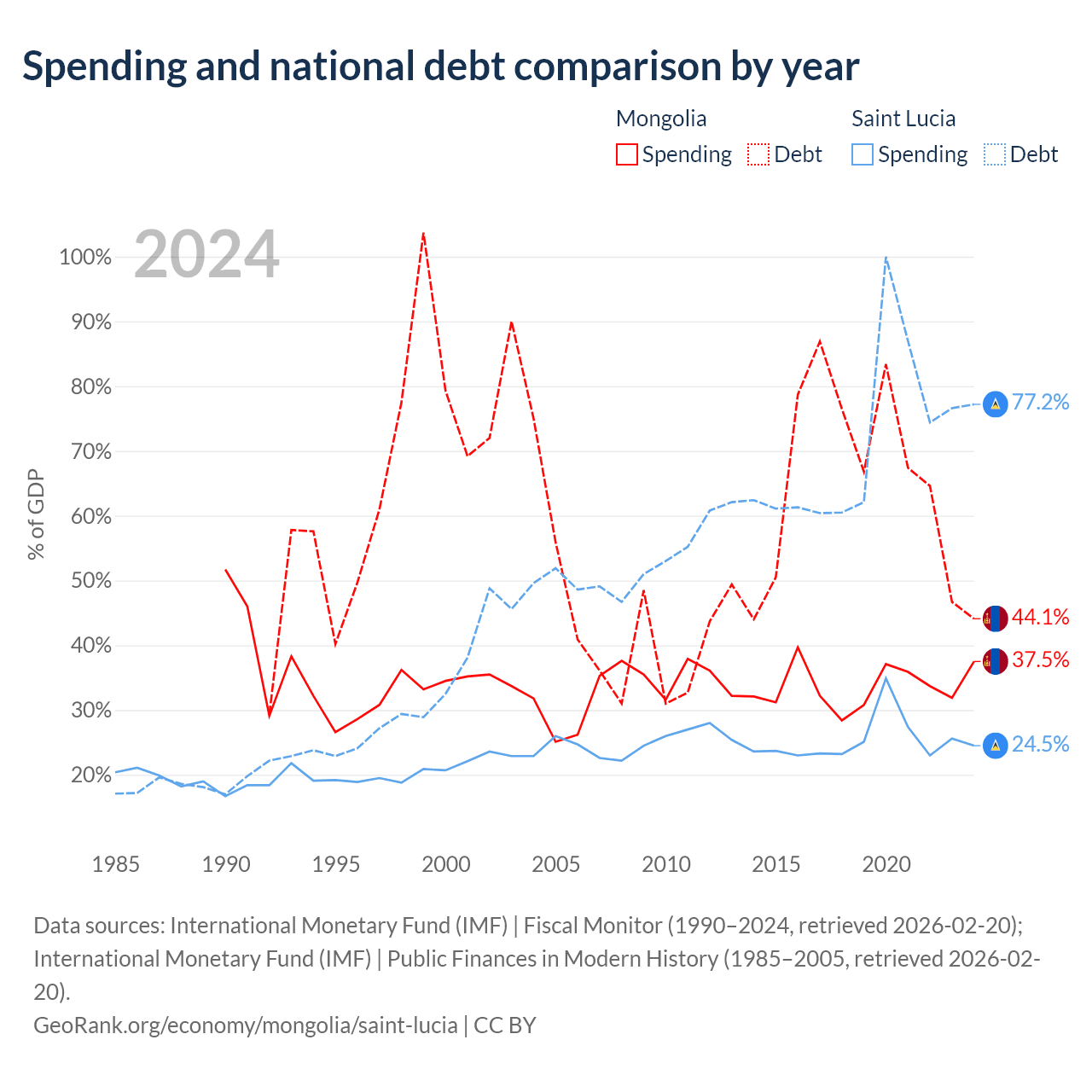 Mongolia has $10.5B in government debt (44.1% of GDP), compared to $1.97B (77.2% of GDP) in Saint Lucia.