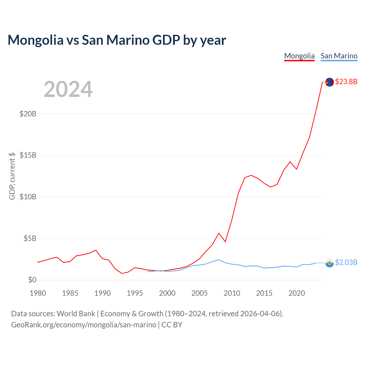 Mongolia has a GDP of $23.8B compared to $2.03B for San Marino, ranking 121/197 and 180/197 by economy size, respectively.